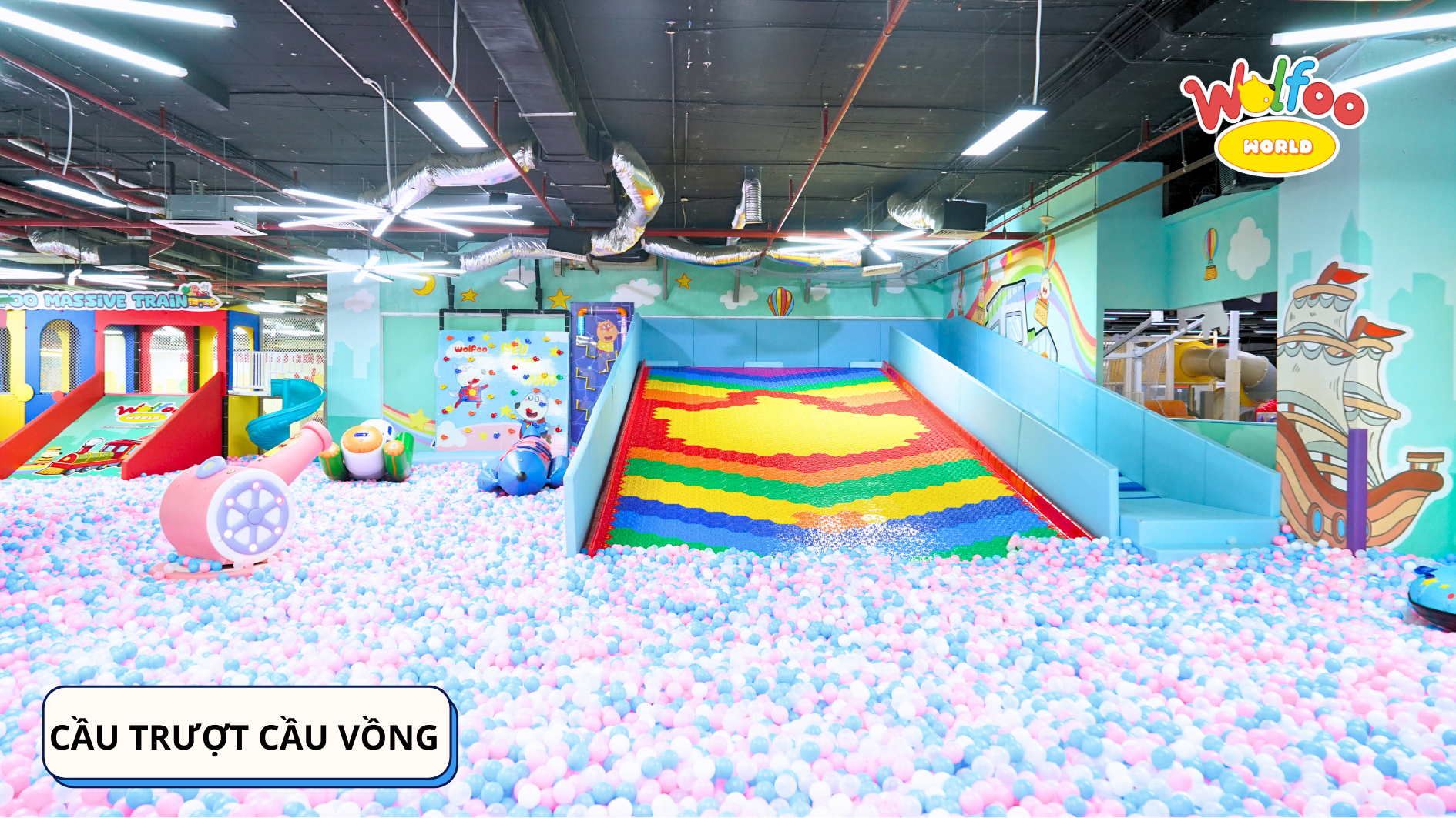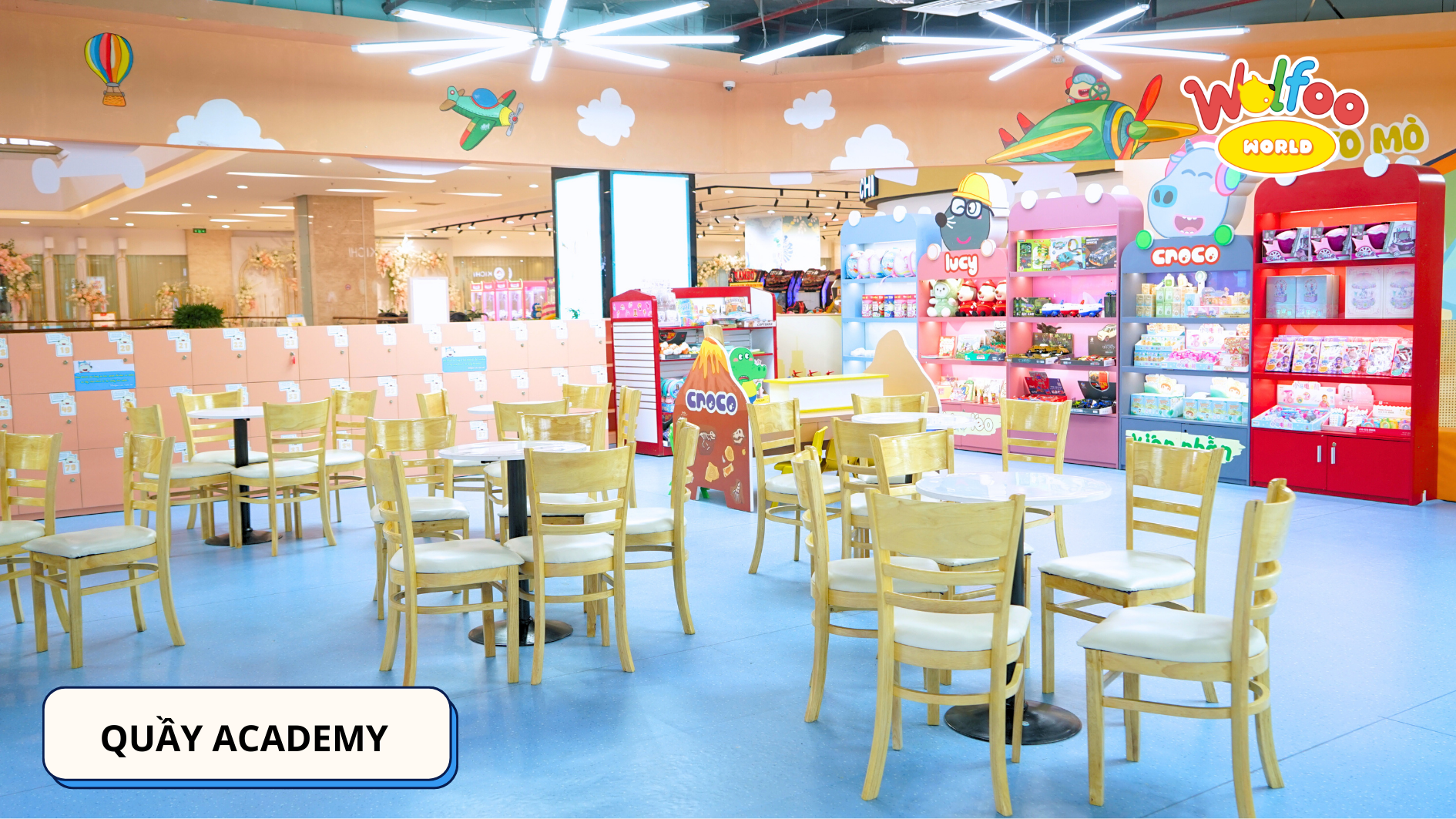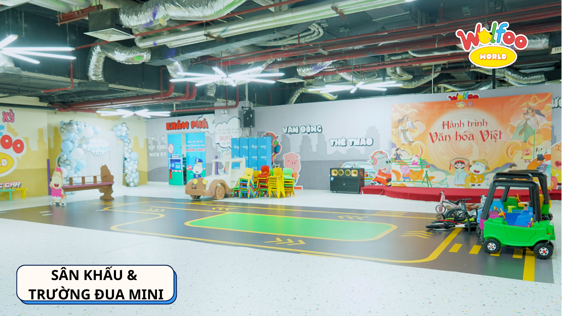 * Khu vực tổ chức sinh nhật: Mang đến cho bé một buổi tiệc sinh nhật vui nhộn và ý nghĩa với không gian được trang trí sinh động và đầy đủ tiện nghi. Bé sẽ có dịp quây quần bên bạn bè, gia đình, đón sinh nhật đáng nhớ cùng Wolfoo.